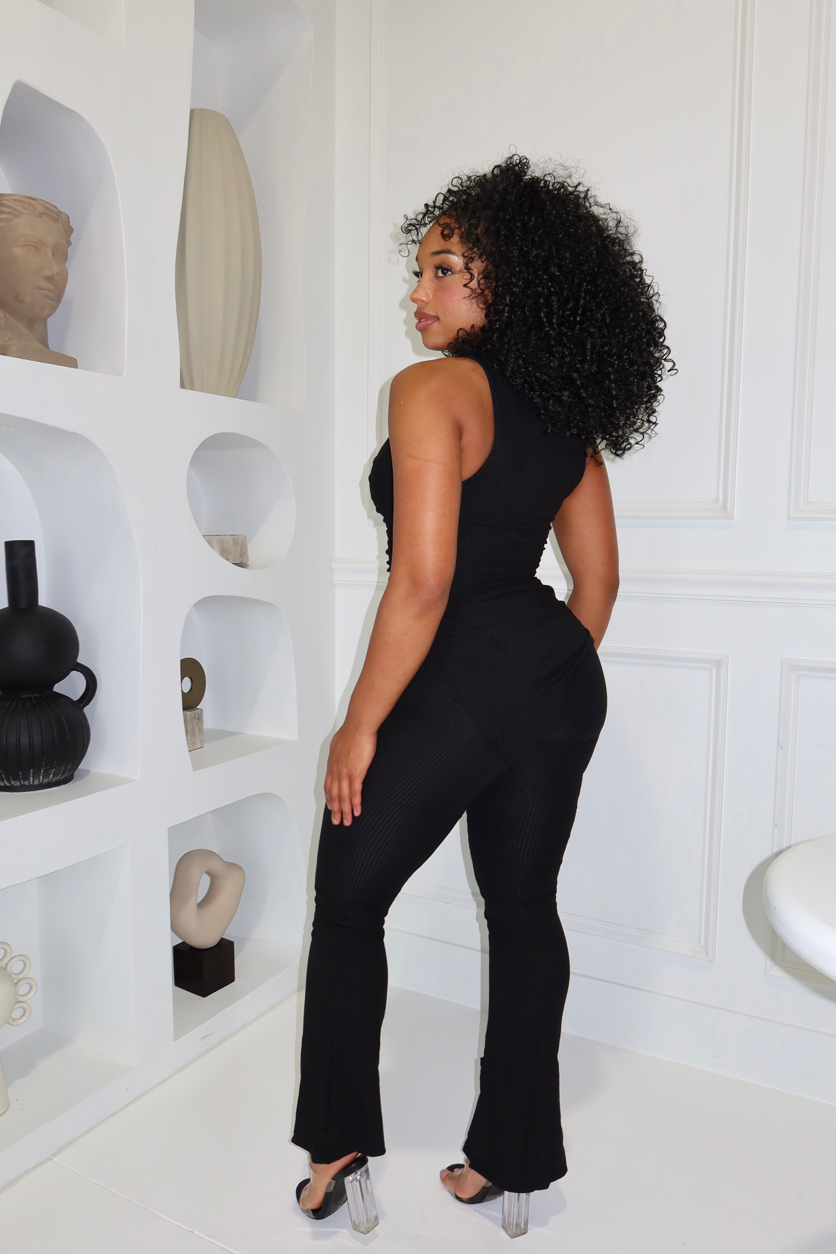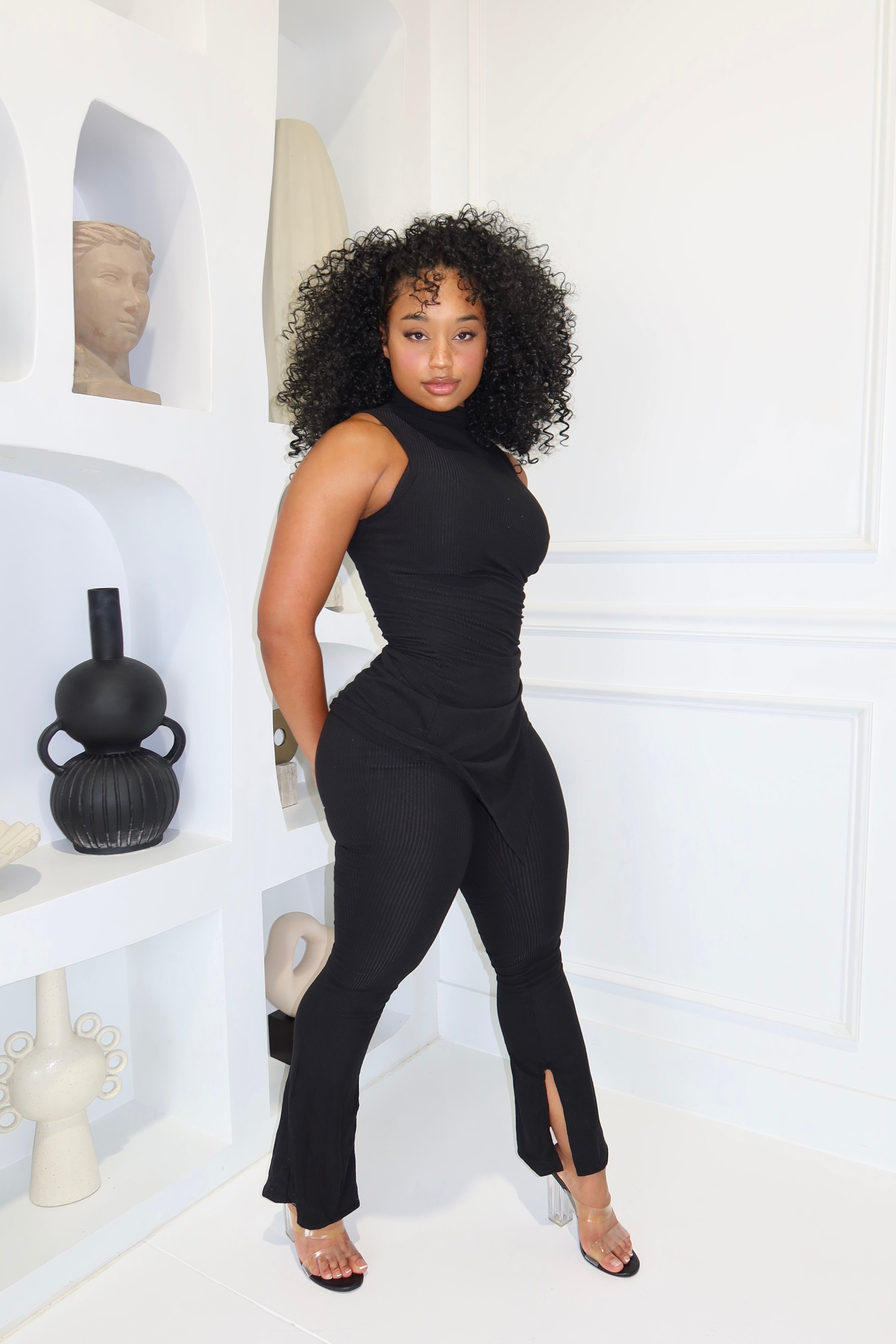 Keep it effortlessly chic in our Black Ribbed Asymmetrical Set, your new go-to for elevated everyday style. This two-piece set features a sleeveless high-neck top with a unique asymmetrical hem that flatters the waistline, paired with matching ribbed flared pants for a smooth, elongated look. Crafted from a soft, stretchy ribbed fabric, it blends comfort and sophistication — perfect for brunch, travel days, or casual nights out.