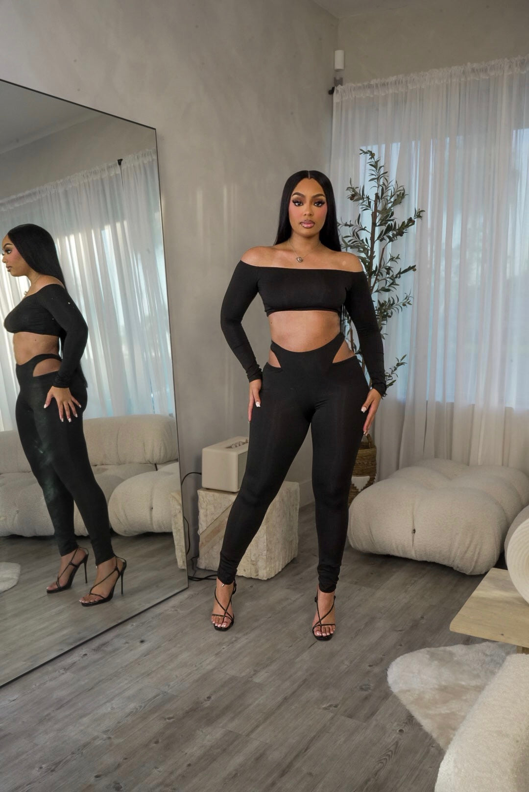 Bold, sleek, and made to stand out. This black two-piece set features an off-the-shoulder long-sleeve crop top paired with high-waist leggings designed with sexy side cutouts that accentuate your curves. Crafted from a soft, stretchy fabric, this set hugs the body for a flattering, sculpted fit while keeping you comfortable. Perfect for nights out, birthday looks, brunch with the girls, or styled up with heels for a statement moment.