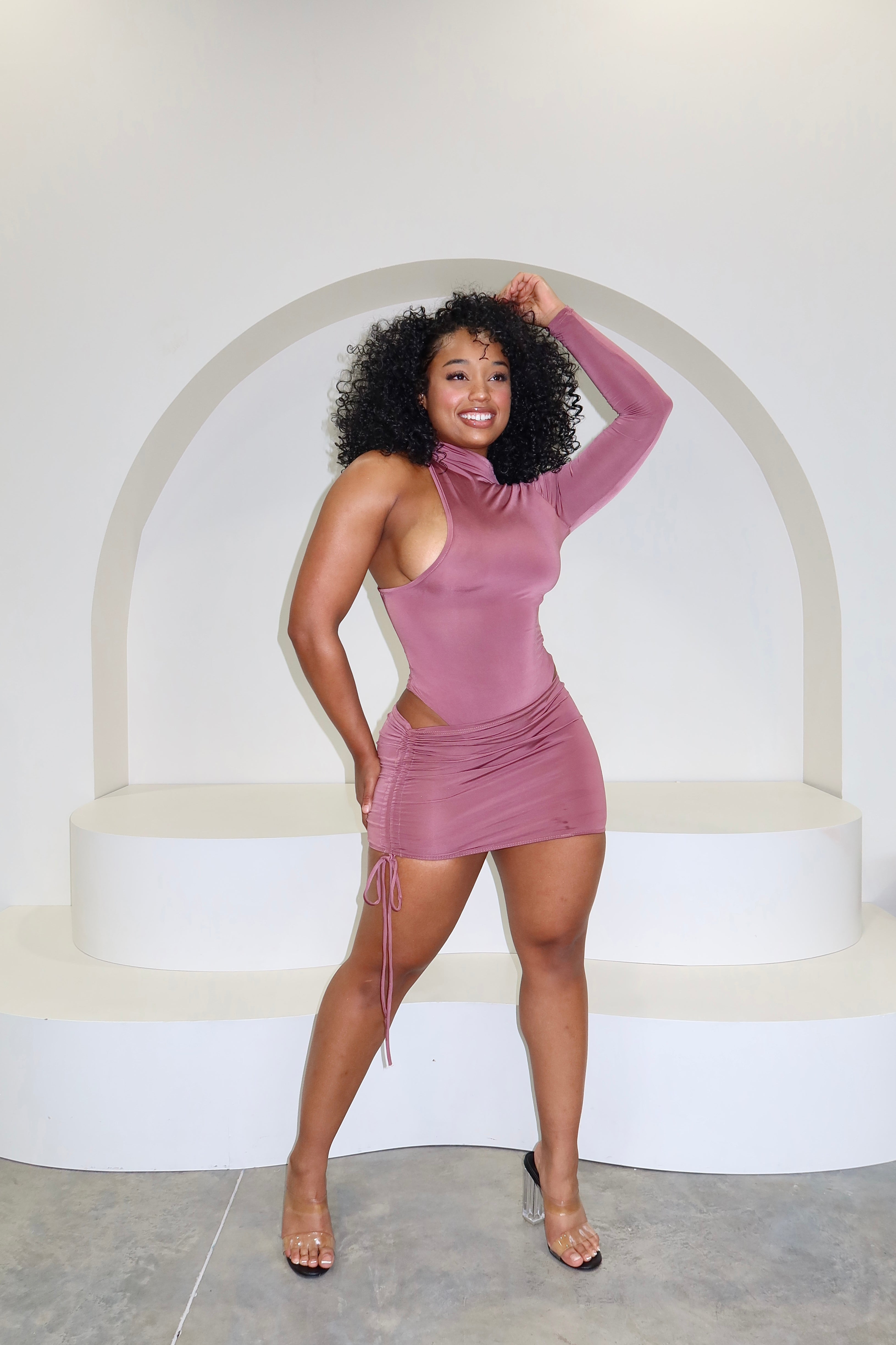 Steal the spotlight in our Mauve One-Sleeve Cutout, designed to make a statement from every angle. This sleek, asymmetrical piece features a single long sleeve, high neckline, and side cutout detailing that adds the perfect mix of bold and chic. The ruched drawstring skirt hugs your curves while letting you adjust the length for your ideal fit. Made with soft, silky stretch fabric, this dress is perfect for a night out, dinner date, or girls’ night.