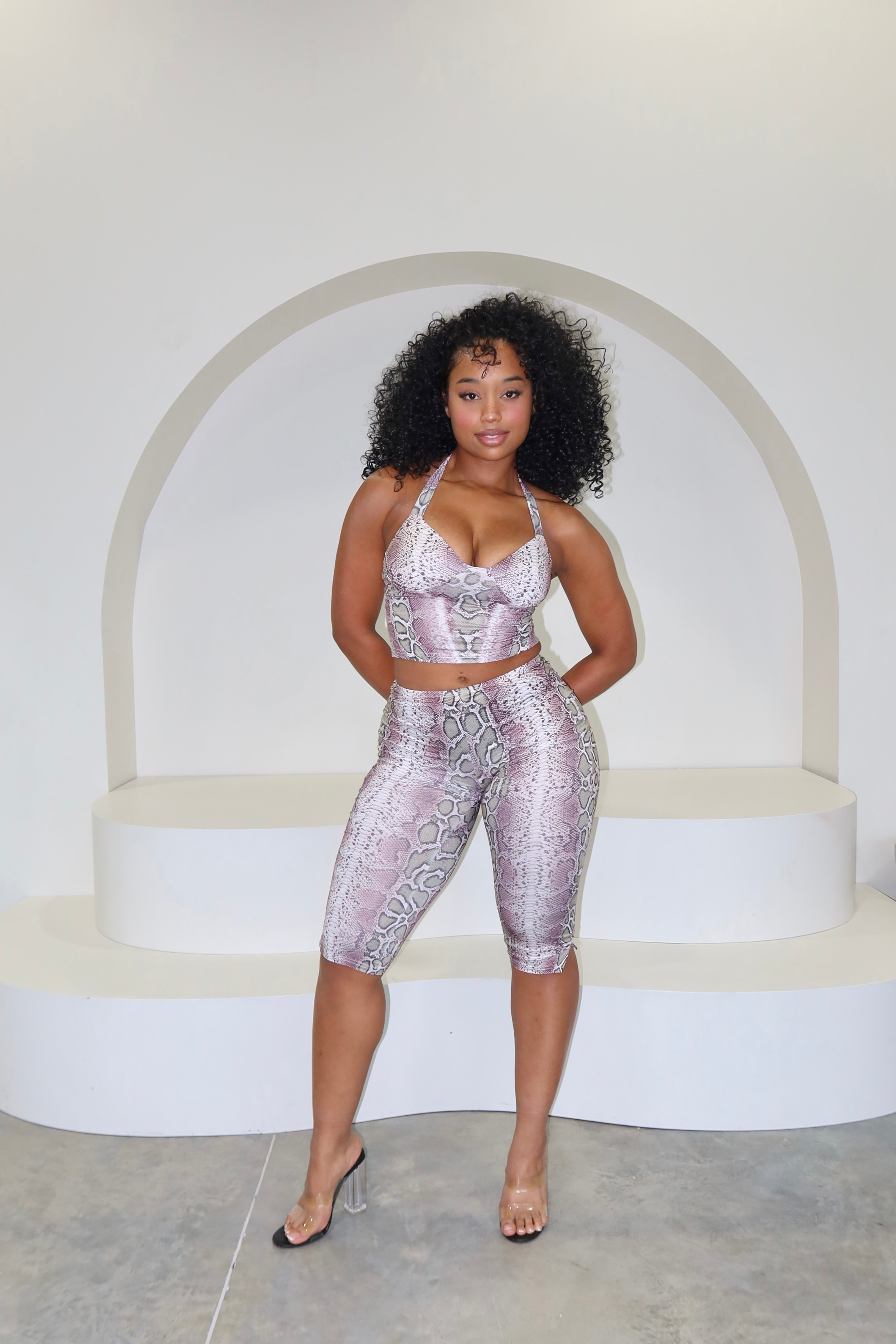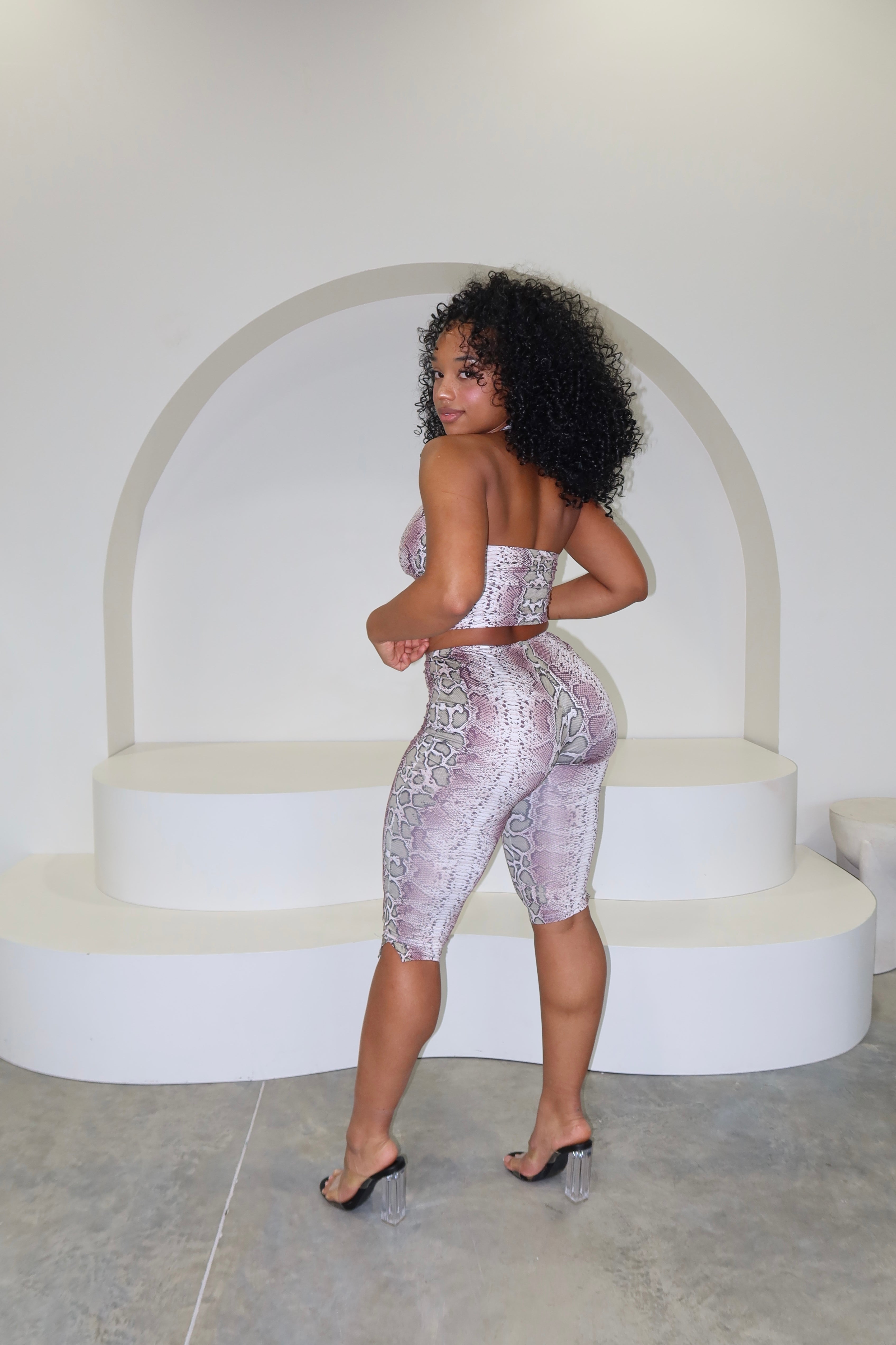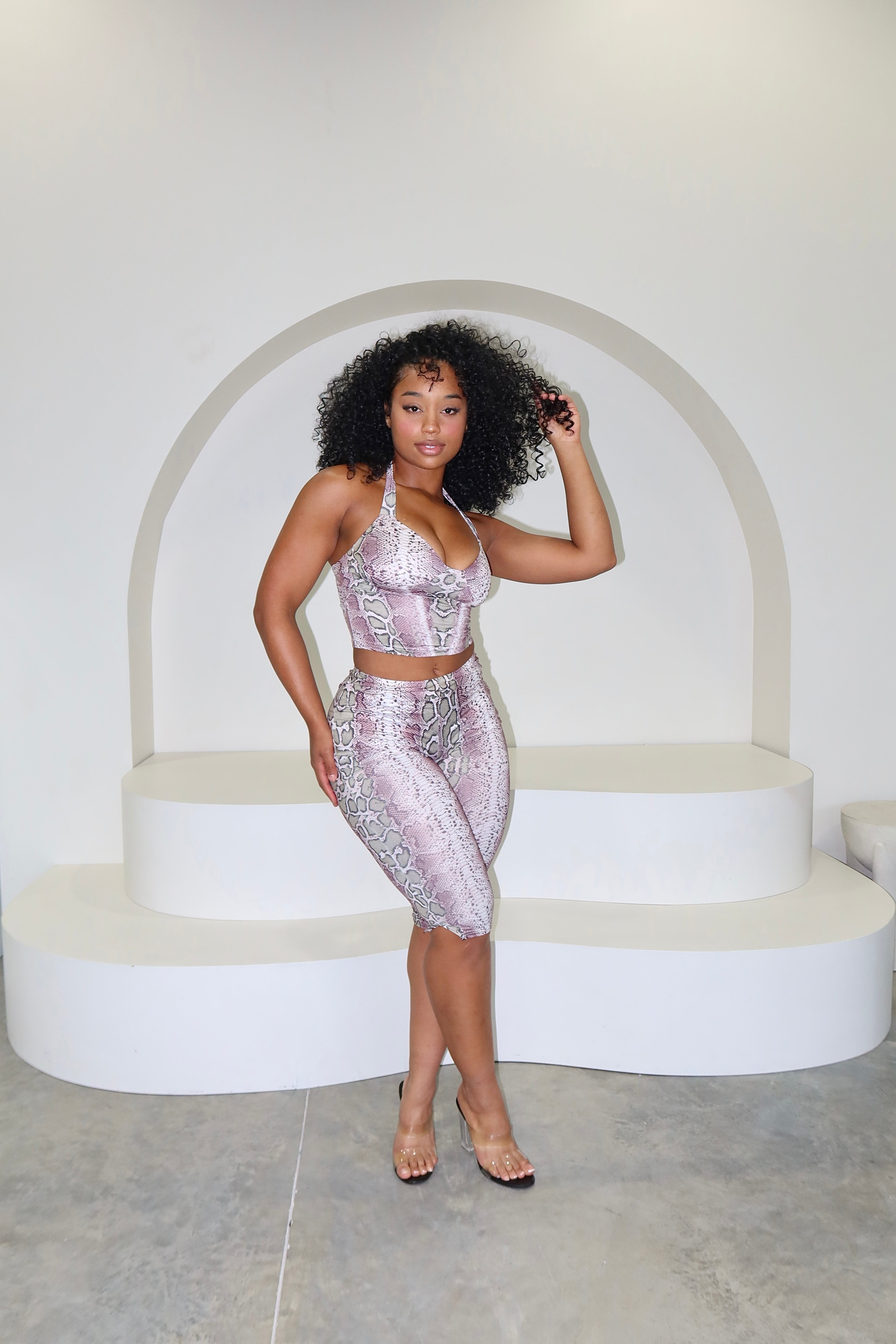 urn up the heat in our Snakeskin Halter Corset Set, made for the confident babe who loves to stand out. This two-piece features a fitted halter corset top with a plunging neckline and matching high-waist biker shorts that sculpt your curves to perfection. The metallic snakeskin print gives it a fierce, luxe vibe — perfect for nights out, concerts, or any moment you want all eyes on you.